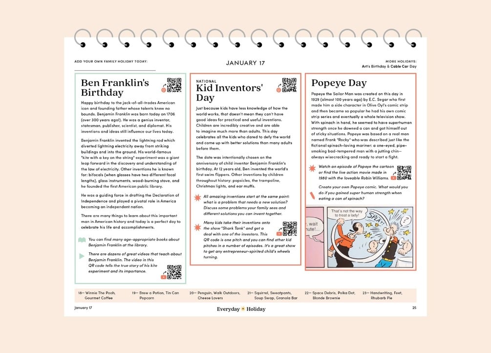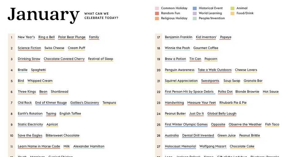 Our calendar is easy to use. Just turn to the day of the year that you want to celebrate and choose from a variety of activities that excite you. Here is an example of the page for January 7th: